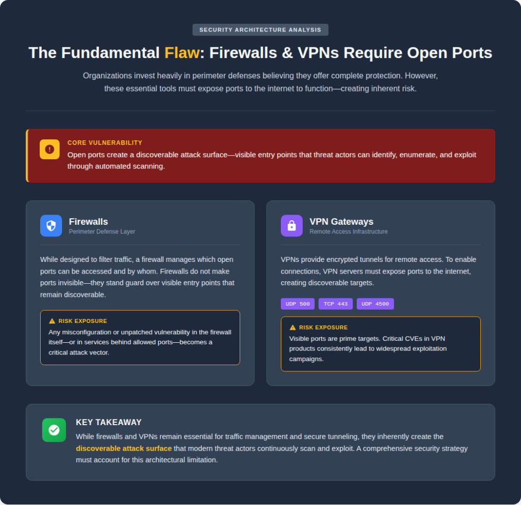 The Fundamental Flaw: Firewalls & VPNs Need Open Ports