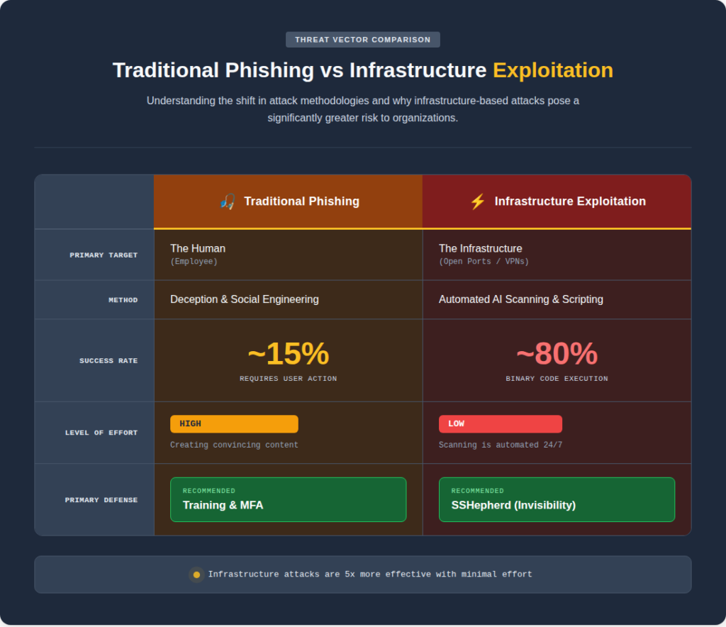 To understand why the industry is shifting its focus, we have to look at the “Success Rate” of an attack. When a hacker sends a phishing campaign, they are playing a game of probability. Industry data suggests a ~15% success rate per campaign; they need to bypass human intuition and MFA.