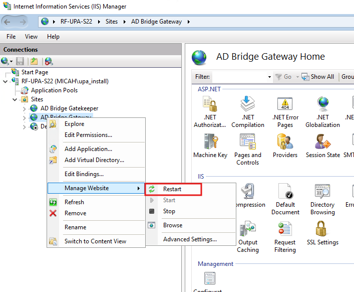 - After making the change, the UPA service in IIS needs to be restarted. It will be in IIS Sites, AD Bridge Gateway as shown below.