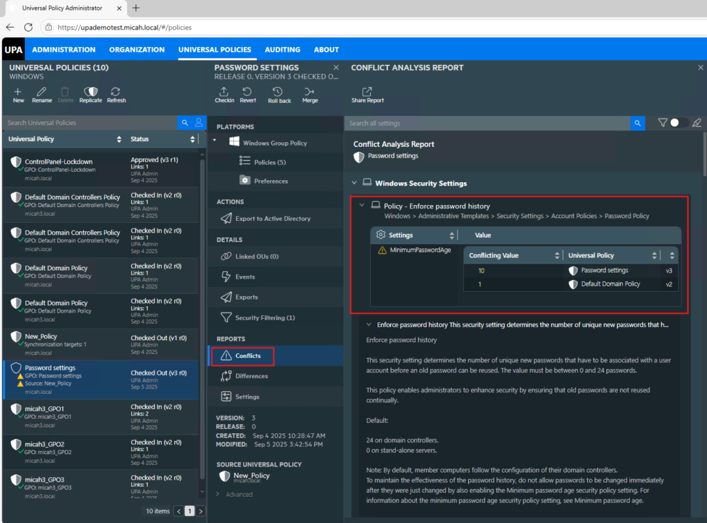 A Conflict Analysis Report shows any other Universal Policies that have the same settings as this Universal Policy but have one or more values on that setting that differ. Universal Policies with identical settings do not appear in this report. This feature is helpful to clean up and consolidate policies.