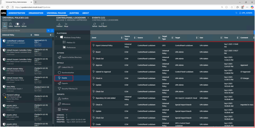 - In the Settings Report tab, click on the release of the Universal Policy.