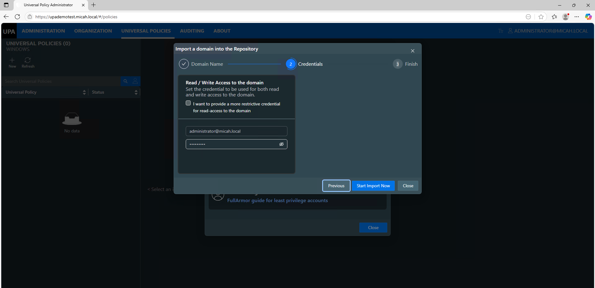 To import a domain or OU into Universal Policy Administrator from the web console: