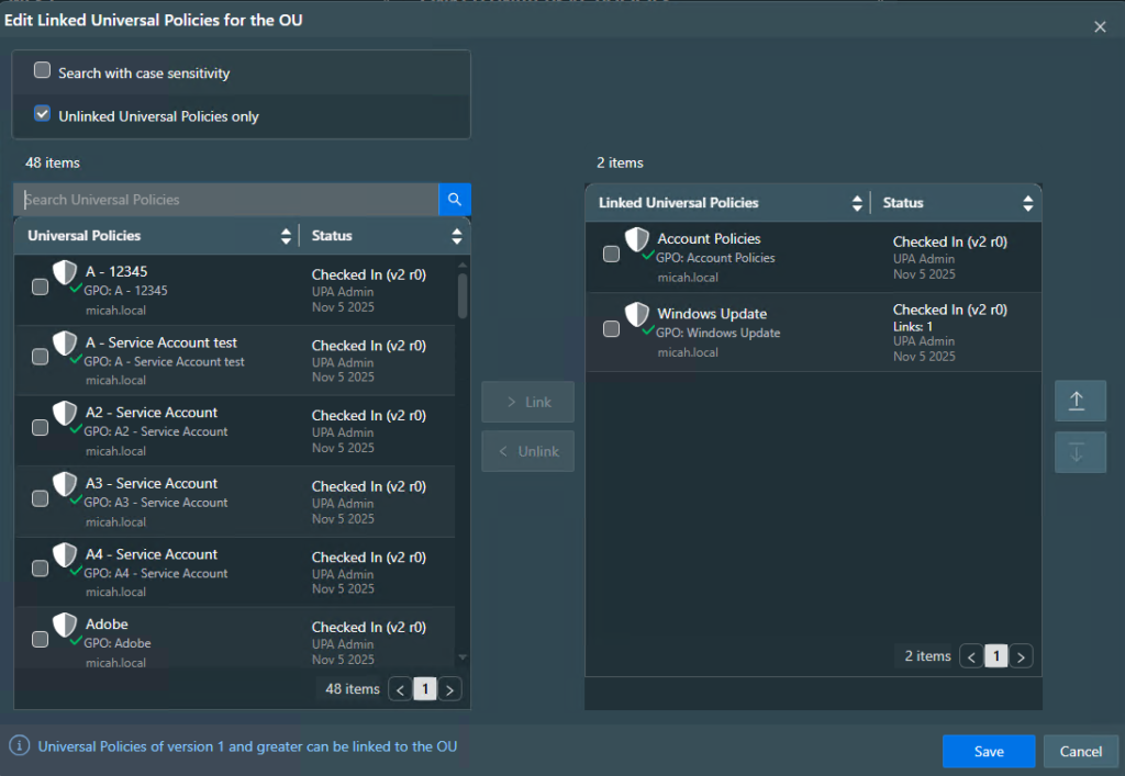 - Select one or more linked Universal Policies and click Link. You can also Unlink, Move Up or Move Down, selected Universal Policies.