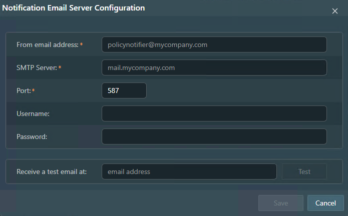 This is usually the full email address (e.g., policynotifier@mycompany.com). - Password: