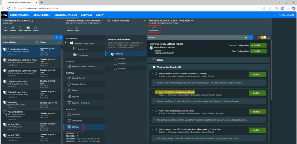 - In the Settings Report tab, click on the release of the Universal Policy.