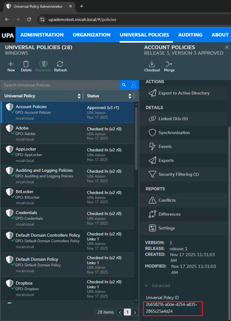 Replace the UPId with a GlobalPolicyId that was generated in step 1 above. Alternatively, you can find the Universal Policy ID (UPId) in the UPA console in the Advanced section (see screenshot below).
