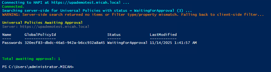 Write-Info "Searching server-side for Universal Policies with status = WaitingForApproval (3) ..."