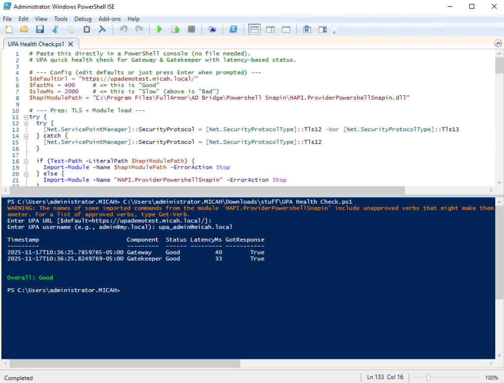 This PowerShell script checks the health and responsiveness of the UPA services (Gateway and Gatekeeper) by testing connectivity, measuring latency, and classifying each service as Good, Slow, or Bad.